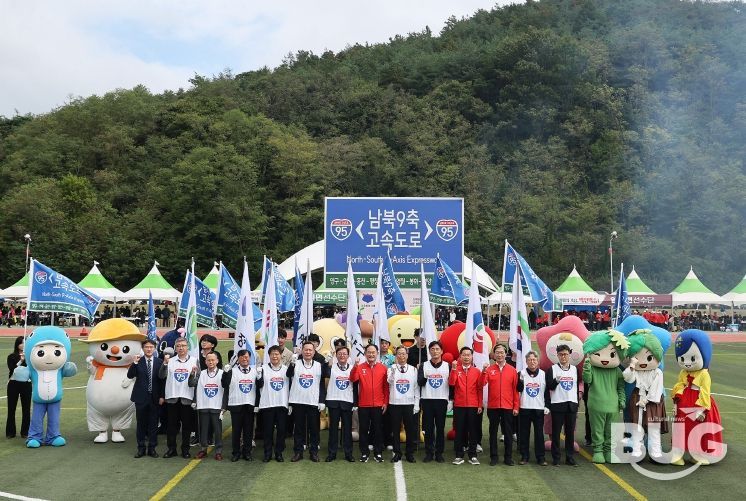 행사는 ‘남북9축, 함께 잇다’ 슬로건 아래 강원·경북 10개 시‧군 대표단이 운동장 양 끝에서 동시에 출발, 중앙에 위치한 제막무대에서 하나로 모여 ‘남북9축 고속도로’ 표지판을 공동 제막하는 순으로 진행됐다.