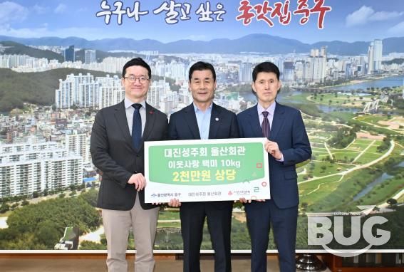 부울경문화뉴스 관리자 기자 | 대진성주회 울산회관이 10월 15일 오후 2시 30분 중구청 구청장실을 찾아 울산사회복지공동모금회를 통해 2,000만 원 상당의 이웃돕기 백미 10kg 540포를 전달했다.