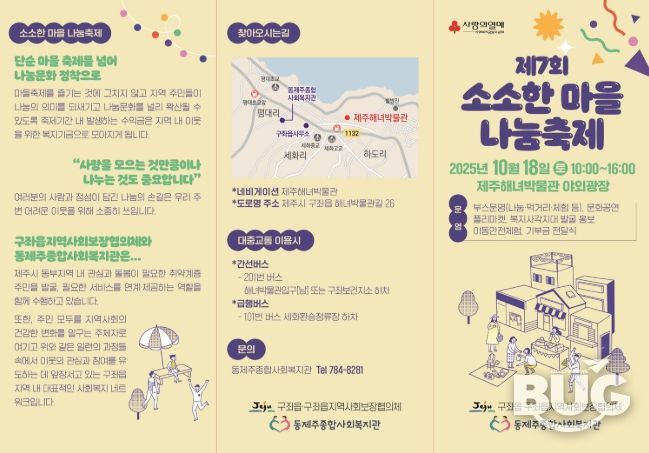 제주시 구좌읍, 구좌읍지역사회보장협의체, 동제주종합사회복지관이 공동으로 주관하는 이번 축제는 ‘사랑을 모으는 것만큼이나 나누는 것도 중요합니다’라는 의미 있는 주제로 개최된다.