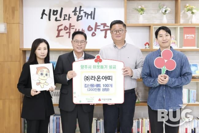 강수현 양주시장은 “매년 꾸준히 다양한 사회공헌활동을 통해 지역사회 발전에 힘쓰시고 있는 라온아띠 대표님과 임직원분들께 진심으로 감사드린다.”며, “기탁받은 성품은 지역의 어려운 이웃을 돕는데 소중하게 쓰겠다.”고 전했다.