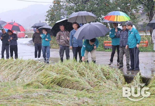 관내 벼 재배면적은 총 538ha로, 이 가운데 미수확 면적이 328ha(61%)에 달하며 도복 피해가 23.6ha, 수발아 피해 25ha, 깨씨무늬병 피해가 40ha로 추정된다.