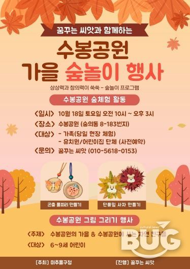 구 관계자는 “이번 가을 숲 놀이 행사를 통해 가족이 함께 가을의 정취를 느끼며 소중한 추억을 쌓고, 아이들은 자연 속에서 배우고 성장하는 뜻깊은 시간을 보내길 바란다.”라고 말했다.