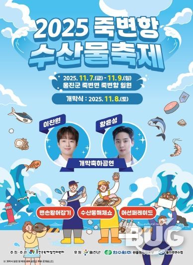 올해 죽변항 수산물축제는‘가자, 죽변항! 먹자, 수산물!’라는 주제로, 싱싱한 방어, 오징어, 전어 등 가을철 수산물을 한자리에서 즐길 수 있는 대표 먹거리 축제로 펼쳐진다.