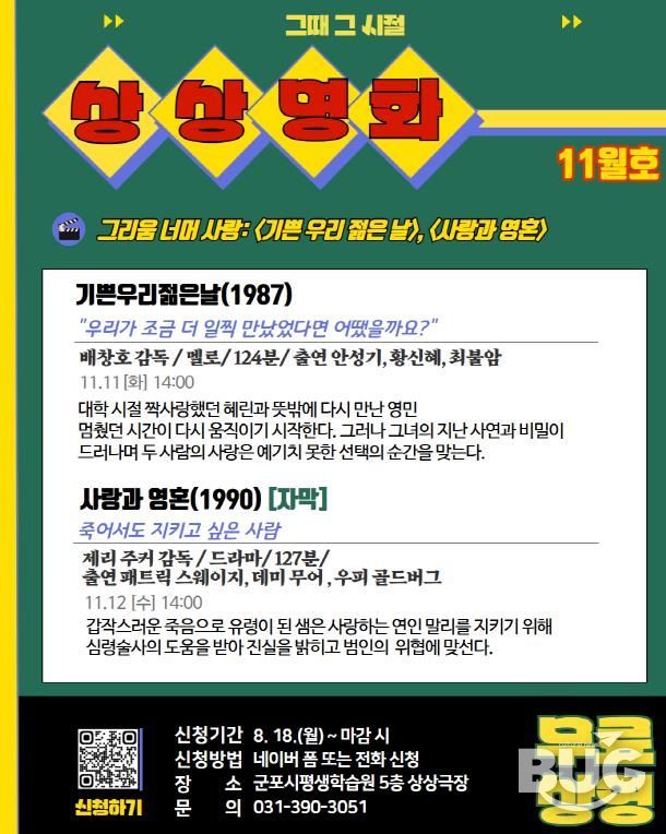 부울경문화뉴스 관리자 기자 | 군포문화재단 군포시평생학습원 상상극장은 오는 11월 11일과 12일 고전영화 상영 프로그램 ‘상상명화’를 운영한다. ‘그리움 너머 사랑’을 주제로 〈기쁜 우리 젊은 날〉과 〈사랑과 영혼〉을 상영한다.