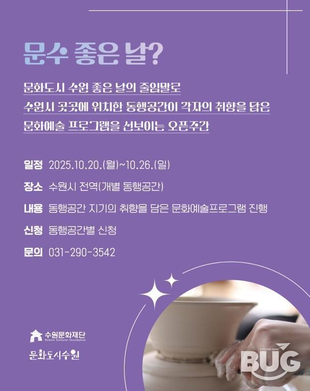 ‘문수 좋은 날’은 ‘문화도시 수원 좋은 날’의 줄임말로, 수원시 전역에 흩어진 동네 문화 거점이자 문화도시 수원과 함께하는 ‘동행공간’에서 문화예술 프로그램을 일주일간 집중적으로 시민들에게 선보이는 기간이다.