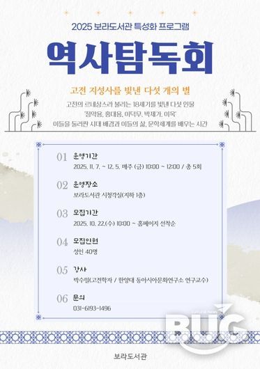 시 관계자는 “역사 탐독회는 전통·역사 특성화 도서관인 보라도서관의 대표 교양 교육 프로그램”이라며 “이번 강의가 시민들이 고전과 역사적 인물을 탐구하며 인문학적 소양을 확대할 수 있는 계기가 됐으면 한다”고 말했다.
