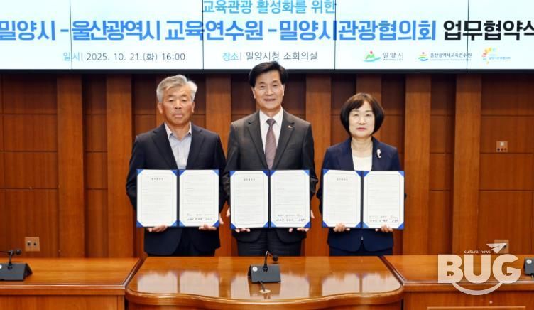 부울경문화뉴스 관리자 기자 | 울산교육연수원은 21일 밀양시청 소회의실에서 경남 밀양시, 밀양시관광협의회와 지역 자원을 활용한 현장 체험 연수 지원 등을 내용으로 하는 업무협약을 체결했다.