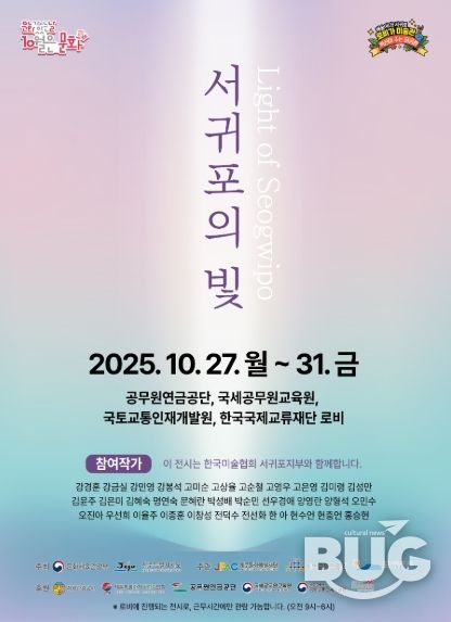 ‘예술이다 서귀포, 혁신이 주는 달콤함’의 피날레를 함께하는 한국미술협회 서귀포지부와 함께하는 특별기획전시 '로비가 미술관: 서귀포의 빛'이 27일(월)부터 31일(금)까지 추진된다. 전시는 공무원연금공단, 국세공무원교육원, 국토교통인재개발원, 한국국제교류재단 로비에서 동시에 펼쳐지며, ‘서귀포의 빛’이라는 주제로 아름답게 빛나는 서귀포의 모습과 색감을 작가들의 다양한 감성으로 표현된 작품을 선보인다. 매일 스쳐지나가는 로비의 풍경에서 영감이 가득한 일터로의 변화를 느낄 수 있도록 기획했다.