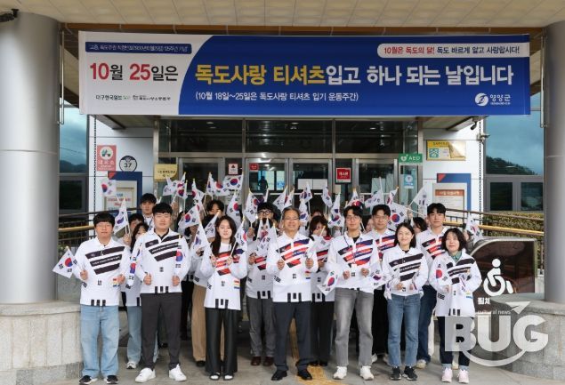 부울경문화뉴스 관리자 기자 | 영양군은 10월 24일 오전 독도의 날을 기념해 군청사 입구에서 오도창 영양군수를 포함한 공직자 60여 명이 참석한 가운데 ‘독도 사랑 티셔츠 입기 운동’행사를 진행했다.