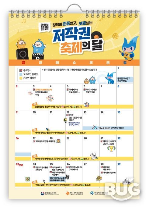 11월 6일에는 범정부 차원에서 해외 지식재산 침해 대응 정책을 논의하기 위해 관계부처와 공공기관, 민간 협회·단체 등 35개 기관이 참여하는 ‘제9차 해외지식재산보호협의체’가 열린다. 11월 12일에는 ‘2025 공유·공공저작물 어워즈’를 열어 저작권 명예기증자와 공유저작물 창작공모전 수상자, 100만 번째 저작권 등록자에게 시상한다. 이와 함께 자작가수 하림이 참여하는 ‘공유로 더해가는 창작의 즐거움’ 토크콘서트, 기증저작물 커버 공연 등 다채로운 무대를 마련한다. 11월 17일과 18일에는 ‘세계 저작권 보호 체계 발전 방향’을 모색하기 위해 국제형사경찰기구(인터폴)와 협력, 국내외 법집행기관이 참여하는 ‘저작권 보호집행 국제포럼’을 개최한다. 11월 28일에는 (사)한국저작권법학회 40주년을 기념해 ‘인공지능 시대의 균형 있는 저작권법 질서’를 주제로 추계 공동 학술대회를 개최한다. 인공지능 기술 발전에 따른 저작권법적 쟁점들을 다각도로 논의할 예정이다.
