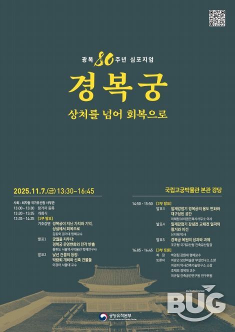 부울경문화뉴스 관리자 기자 | 국가유산청 궁능유적본부는 광복 80주년을 맞아 11월 7일 오후 1시 30분, 국립고궁박물관 본관 강당에서 '광복 80주년 경복궁, 상처를 넘어 회복으로' 학술 토론회(심포지엄)를 개최한다.