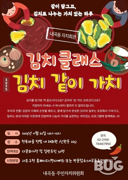 내곡동 주민자치위원회와 내곡동 주민센터가 공동 주최하는 이번 행사는 주민이 함께 모여 김치를 배우고 담그고 나누는 과정을 통해 ‘같이의 가치’를 실천하는 따뜻한 지역공동체 프로그램으로 마련됐다.