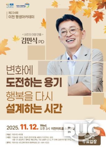 부울경문화뉴스 관리자 기자 | 이천시는 오는 11월 12일 오후 3시, 이천아트홀 소공연장에서 제224회 이천평생아카데미를 개최한다. 이번 아카데미에는 MBC 드라마 프로듀서(PD) 출신이자 저널리즘 교수로 활동 중인 김민식 교수를 초청해 ‘변화에 도전하는 용기, 행복을 다시 설계하는 시간’이라는 주제로 특별 강연을 진행한다.
