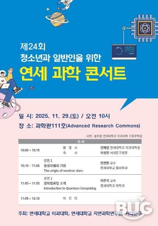 부울경문화뉴스 관리자 기자 | 서대문구가 연세대학교 이과대학과 공동으로 이달 29일 토요일 오전 10시부터 2시간여 동안 연세대 과학관 111호에서 ‘제24회 연세 과학 콘서트’를 개최한다.