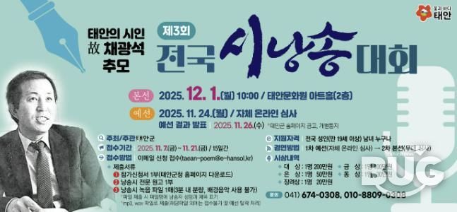 12월 1일 진행되는 본선은 예선 심사 결과에 따라 최대 50명이 참가할 것으로 예상되며, 오전 10시부터 태안문화원 아트홀에서 현장 낭독 방식으로 진행된다.