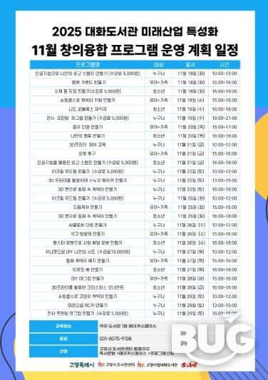 부울경문화뉴스 관리자 기자 | 고양특례시 대화도서관은 덕이도서관 1층 메이커스페이스(이전 공간)에서 초등학생부터 성인을 대상으로 11월 ‘미래산업 특성화 창의융합 프로그램’을 운영한다고 밝혔다.