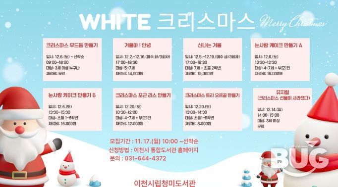 부울경문화뉴스 관리자 기자 | 이천시 청미도서관이 다가오는 크리스마스를 맞아 가족이 함께 즐길 수 있는 다채로운 겨울 프로그램을 운영한다. 이번 프로그램은 유아부터 가족 단위 이용자까지 모두가 참여할 수 있도록 구성되어, 따뜻하고 포근한 겨울 감성 속에서 즐겁고 뜻깊은 경험을 선사할 예정이다.