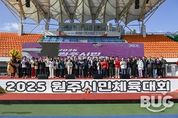 부울경문화뉴스 관리자 기자 | 지난 1일 원주종합운동장에서 열린 ‘2025 원주시민 체육대회’가 시민들의 뜨거운 참여와 응원 속 성황리에 마무리됐다. 원주시체육회가 주최·주관한 이번 대회는 원주시 승격 70주년을 기념해 열렸으며, 25개 읍면동에서 3천여 명의 선수단과 시민들이 참여해 세대와 지역을 아우르는 시민 화합의 대축제로 펼쳐졌다. 개회식에는 원강수 시장과 조용기 시의장을 비롯해 지역 국회의원, 기관·단체장 등이 참석해 선수단을 격려하고, 읍면동별 입장 퍼레이드와 단체 퍼포먼스를 함께 관람하며 축제 분위기를 더했다. 읍면동별 입장식에서는 각 지역의 특색을 살린 다채로운 퍼레이드와 퍼포먼스가 진행돼 관람객들의 큰 호응을 얻었다. 또한 원주시 홍보대사 공훈의 축하공연 등을 통해 시민들의 눈과 귀를 즐겁게 하며 흥겨운 축제의 장을 만들었다. 경기는 고령화 비율에 따라 1부와 2부로 나누어 진행됐으며, 5인6각 달리기, 단체줄넘기, 여자 PK, 파크골프 퍼팅, 훌라후프, 줄다리기, 혼성이어달리기 등 남녀노소 누구나 참여할 수 있는 생활체육 중심의 프로그램으로 구성돼 즐거운 함께한 체육