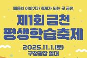 부울경문화뉴스 관리자 기자 | 금천구는 11월 1일 오전10시 금천구청 광장 일대에서 ‘제1회 금천평생학습축제’를 개최한다고 밝혔다. 축제는 ‘배움의 이야기가 축제가 되는 곳, 금천’을 주제로, 구 개청 30주년과 평생학습도시 지정 12주년을 기념해 마련됐다. 학습자, 동아리, 기관과 단체가 함께 어우러져 그동안의 학습 성과를 나누고 주민이 즐길 수 있는 학습문화 축제다. 축제 공간은 금천구 도시브랜드인 ‘행복도시, 학습도시, 문화도시, 상생도시’ 4개 구역으로 나뉘어, 공연·체험·전시·홍보 등 51개 프로그램이 운영된다. 관람객들은 각 도시를 여행하듯 공간을 이동하며 다양한 프로그램을 체험하고, 스탬프를 모으면 학습 이벤트 참여 기회를 얻을 수 있다. 주 무대인 썬큰광장에서는 시흥3동 주민자치 프로그램 ‘신바람 노래교실’의 축하공연을 시작으로, 금천시민대학과 평생학습 동아리들의 공연이 이어진다. 오후 1시 개막식에는 금천시민대학 ‘바른 자세와 모델워킹’ 수료생들의 특별 공연과 브라스 밴드 무대가 펼쳐져 현장을 더욱 빛낼 예정이다. 구청 광장에서는 인공지능(AI) 면접 체험, 디지털 그림그리기(페인
